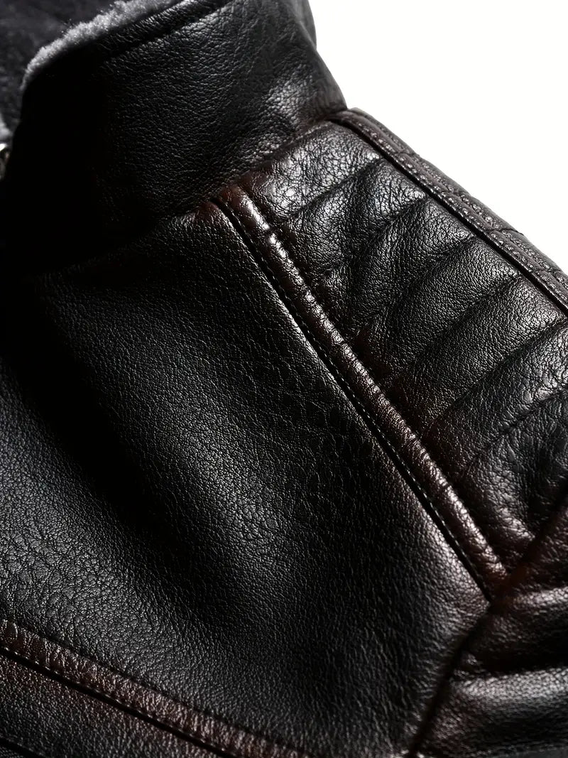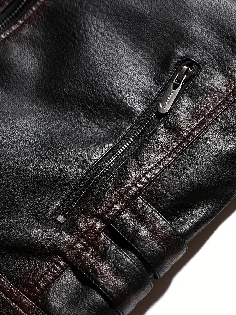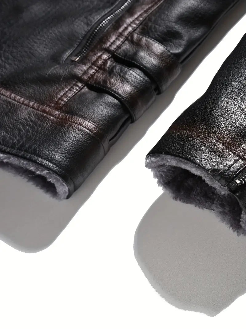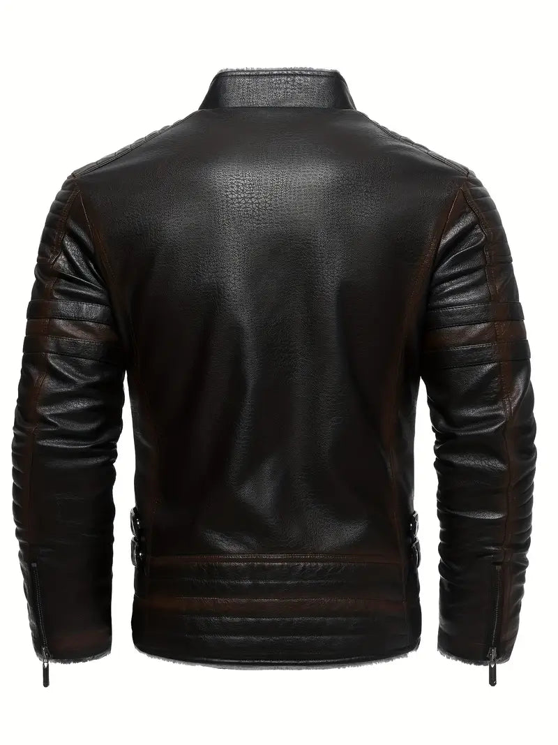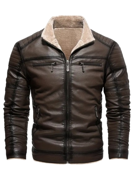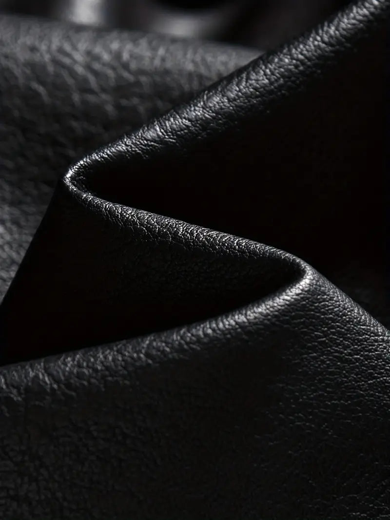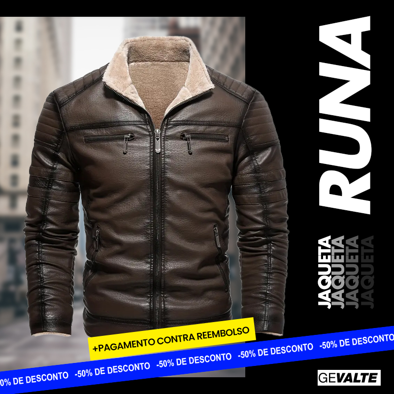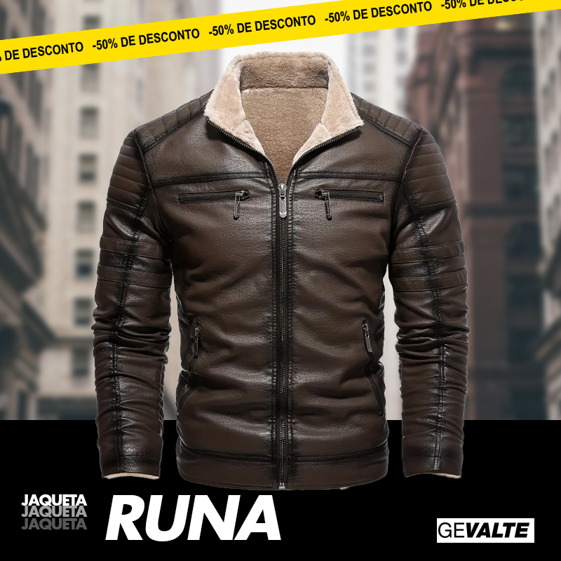 A jaqueta Runa é fabricada com couro vegano de alta qualidade, projetado para oferecer um acabamento premium que imita a textura e a aparência do couro genuíno, mas com um enfoque ético e sustentável.